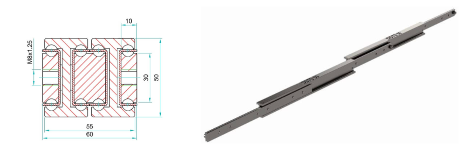 DDTS-50导轨在闭合长度600mm可以延展1200mm行程(完全展开总长度1800mm), 载重达到240kg。由五节冷抽钢制成, 并装配珠槽及钢珠, 导轨在闭合静置的情况下有相当好的抗震抗冲击性能以承受动态负载, 因此适合安装于车载环境应用。这是一款非常坚固的导轨, 采用工字梁结构, 提供轴向和同轴扭矩负载的高抗性, 以达成延展后最小化挠曲和操作力。